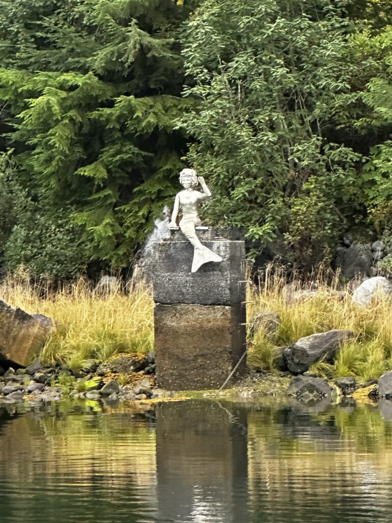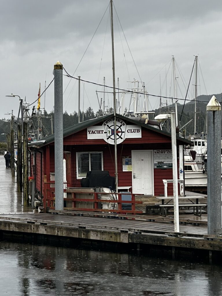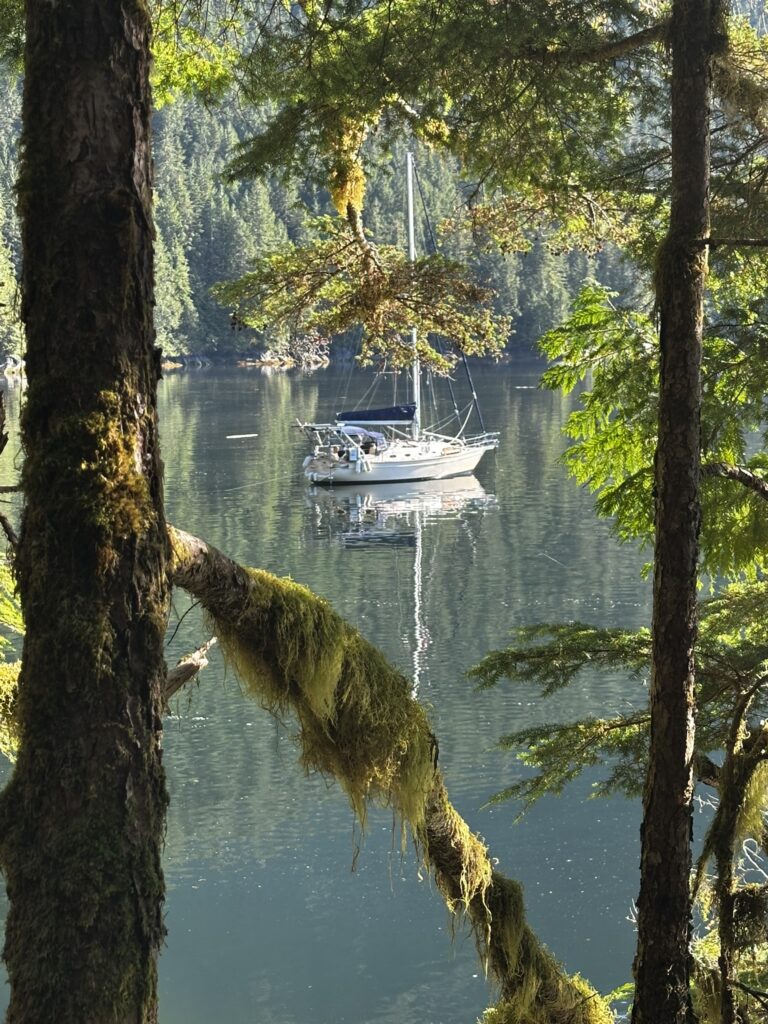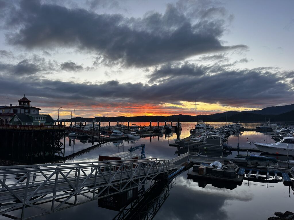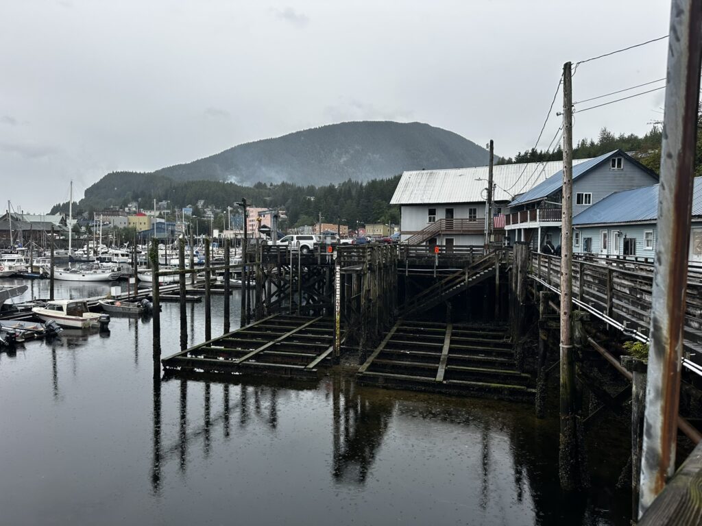 We had stopped in Ketchikan years ago on a commercial Alaskan cruise and were looking forward to exploring it from our own boat, at our own pace. There are several marinas in Ketchikan and we chose to stay at the Thomas Basin Marina which is in downtown, near where the cruise ships tie up. In fact, with about 15 knots of wind on our beam, we had to pass around the front a Holland America ship to enter our marina. This turned out to be a great location. Although somewhat busy during the day when multiple cruise ships are in, the last one leaves around 6:30 pm and the town is quiet after that. There are no amenities at that marina, however, the Ketchikan Yacht Club is in the same location and offers the use of their facilities for a small daily fee. So we had access to showers, laundry, a kitchen, and a place to hang out off the boat. They also have slips for transient boats that we will certainly take advantage of on our way back north. We had fun walking around town. Our highlights were the Salmon Walk (a two mile walk along the river with salmon swimming upstream), the Bawden Street Brewing Co., Baleen Brewing, The Bush Pilot’s Lounge (excellent food and a great view) and the 108 Tap House and Burger Bar (amazing burgers). There are some great hikes in the area but unfortunately we were fighting colds while there and didn’t do any this time around. The bus system is easy to use and made grocery shopping easy.