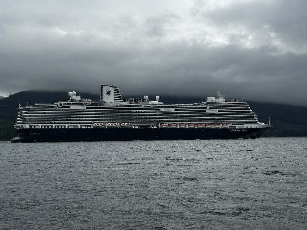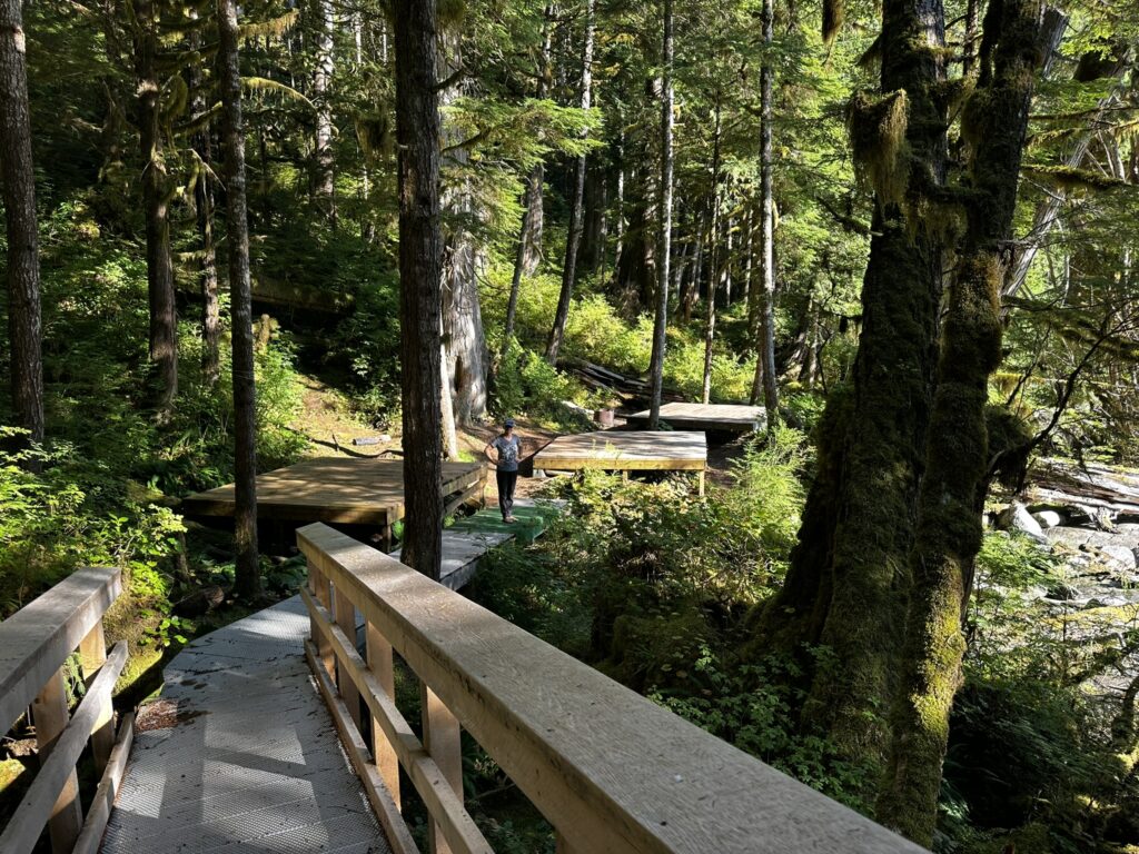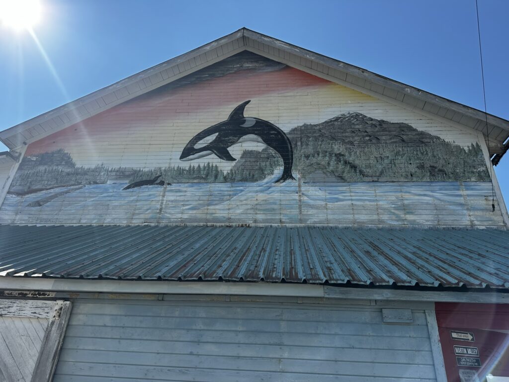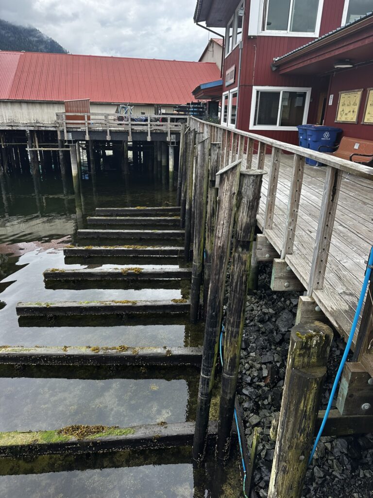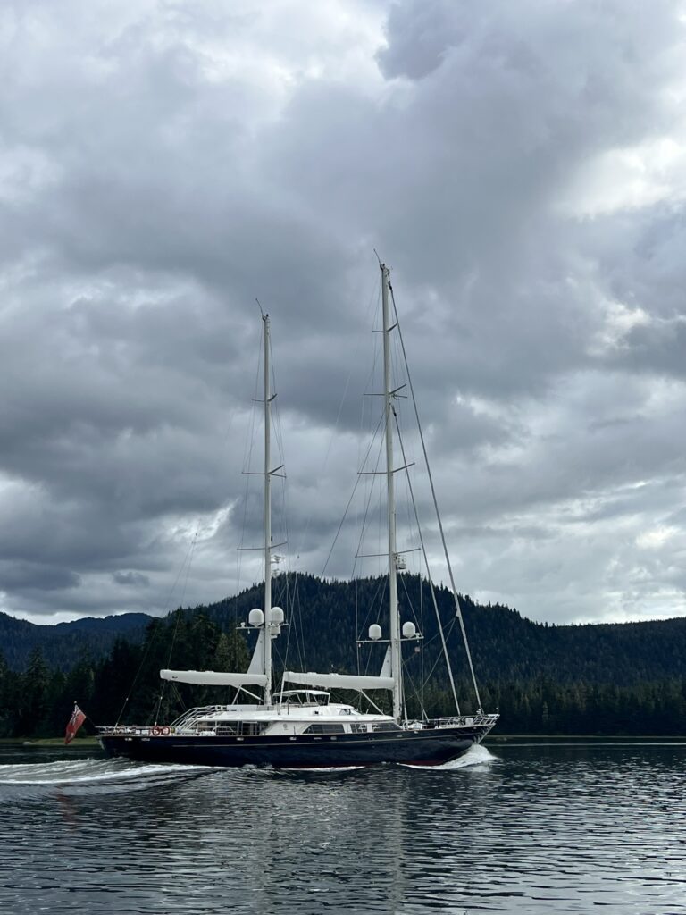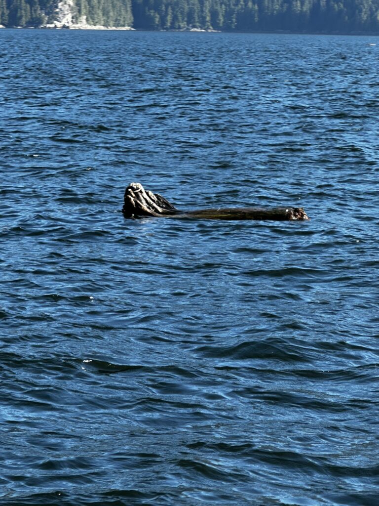 We had stopped in Ketchikan years ago on a commercial Alaskan cruise and were looking forward to exploring it from our own boat, at our own pace. There are several marinas in Ketchikan and we chose to stay at the Thomas Basin Marina which is in downtown, near where the cruise ships tie up. In fact, with about 15 knots of wind on our beam, we had to pass around the front a Holland America ship to enter our marina. This turned out to be a great location. Although somewhat busy during the day when multiple cruise ships are in, the last one leaves around 6:30 pm and the town is quiet after that. There are no amenities at that marina, however, the Ketchikan Yacht Club is in the same location and offers the use of their facilities for a small daily fee. So we had access to showers, laundry, a kitchen, and a place to hang out off the boat. They also have slips for transient boats that we will certainly take advantage of on our way back north. We had fun walking around town. Our highlights were the Salmon Walk (a two mile walk along the river with salmon swimming upstream), the Bawden Street Brewing Co., Baleen Brewing, The Bush Pilot’s Lounge (excellent food and a great view) and the 108 Tap House and Burger Bar (amazing burgers). There are some great hikes in the area but unfortunately we were fighting colds while there and didn’t do any this time around. The bus system is easy to use and made grocery shopping easy.