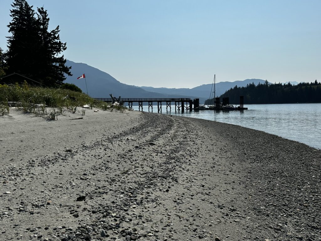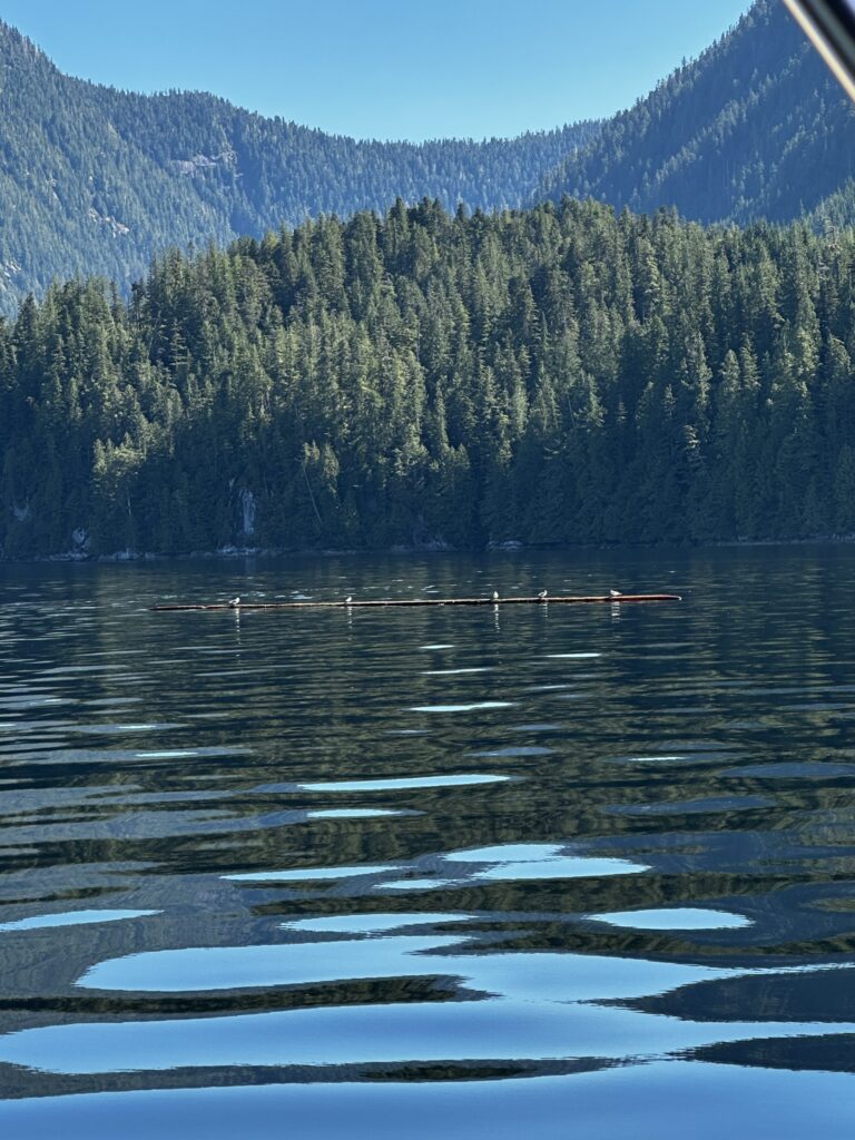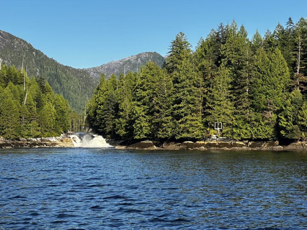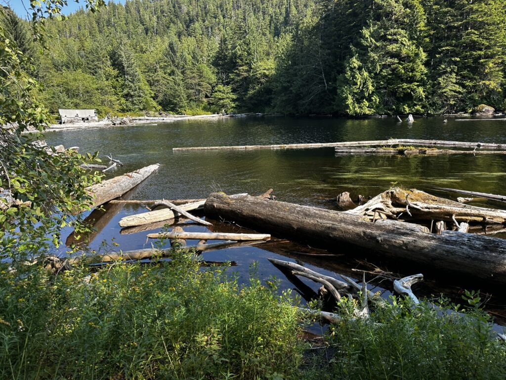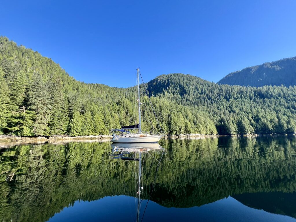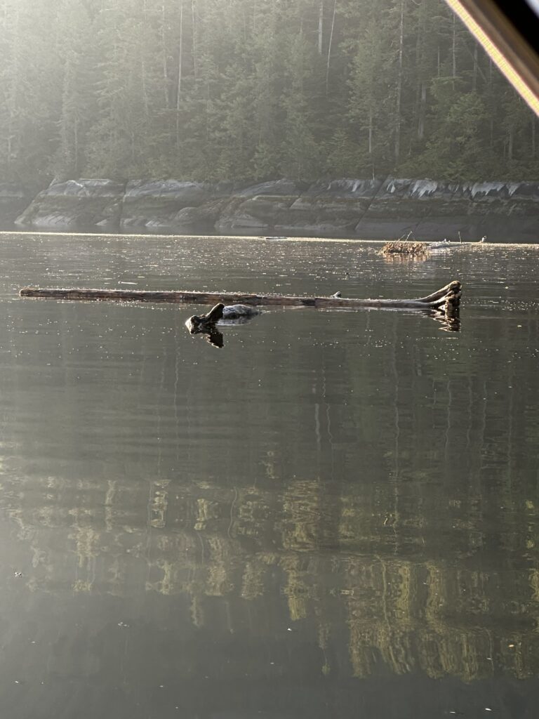 The fog held up until about 2 pm that day but fortunately cleared before we got to our next anchorage in Bottleneck Cove. This is a well protected anchorage with a very narrow, shallow entrance. Once inside it was flat calm. We awoke to thick fog the next day but chose to continue on to the small village of Shearwater. This is a First Nations community with a small resort and marina. It was very pleasant with a well stocked store, nice facilities, and a great restaurant. I highly recommend the seafood chowder and the Caesar salad. No joke, they were amazing. There was also a great hike near the marina to Eddie Lake. We took the ferry over to Bella Bella, a nearby town, but there wasn’t much going on there. We’ll skip it next time.