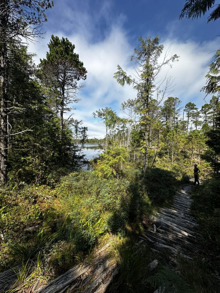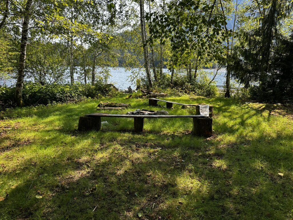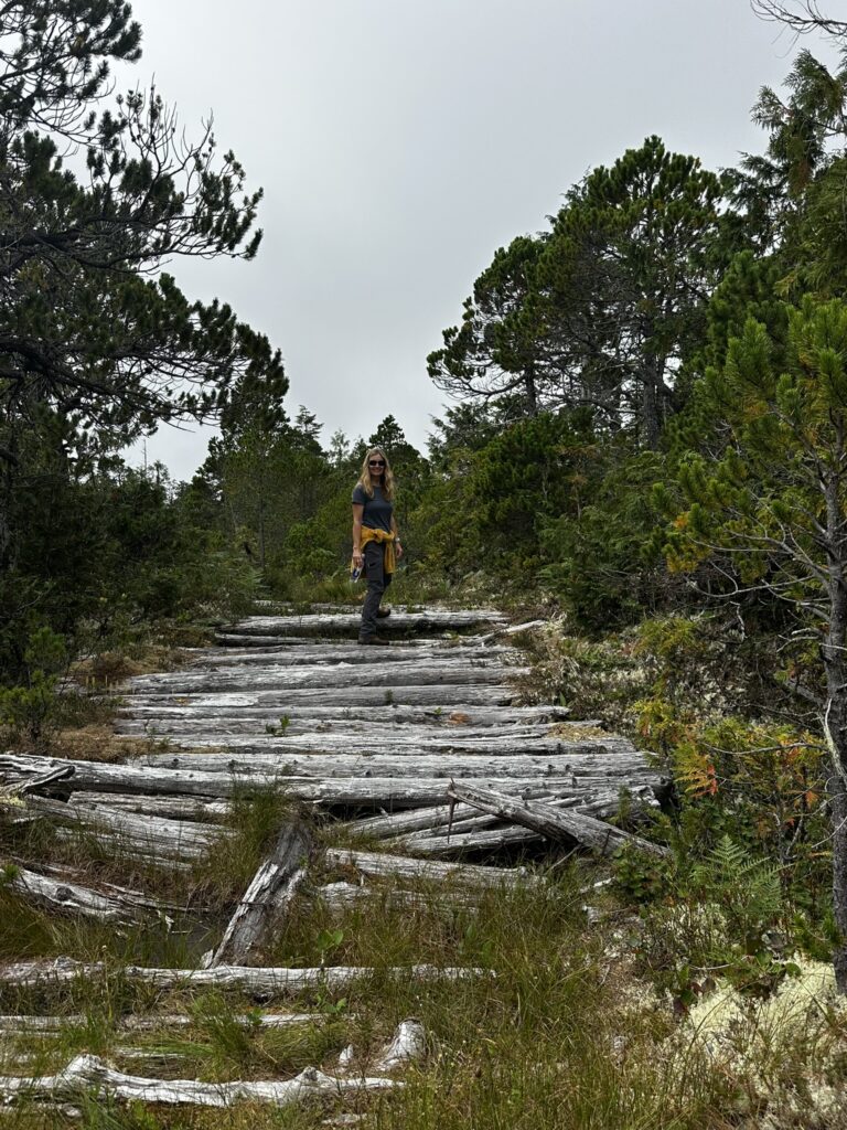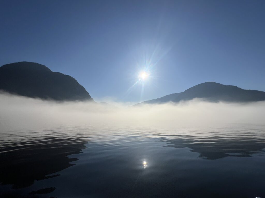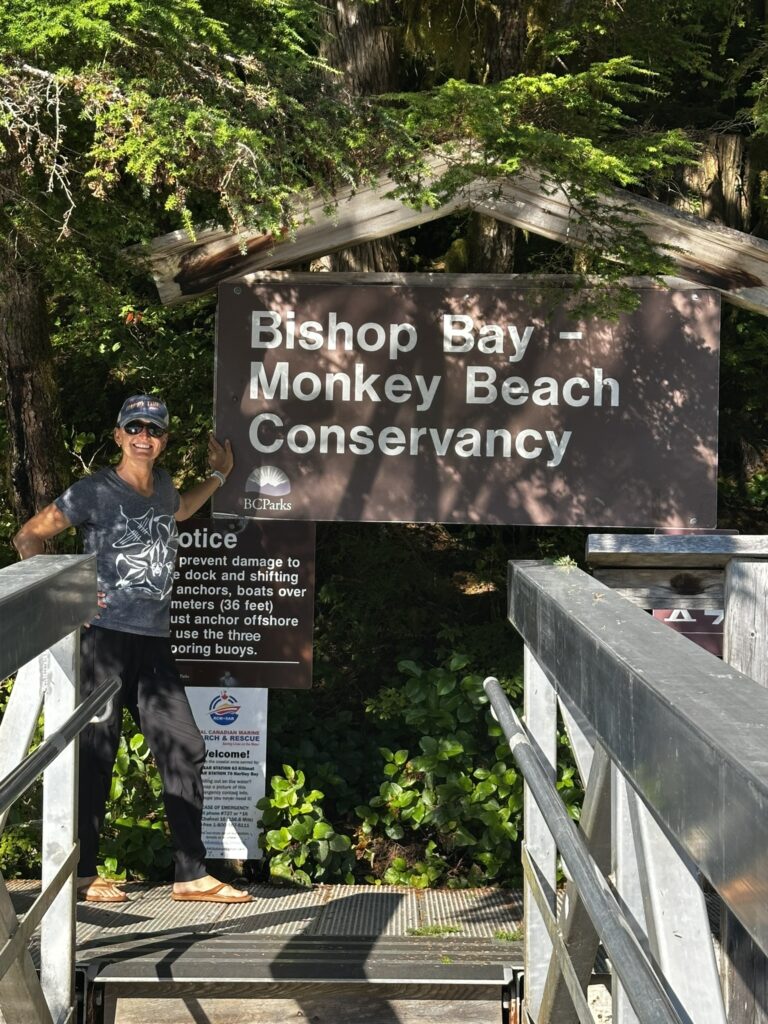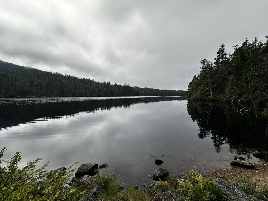 The fog held up until about 2 pm that day but fortunately cleared before we got to our next anchorage in Bottleneck Cove. This is a well protected anchorage with a very narrow, shallow entrance. Once inside it was flat calm. We awoke to thick fog the next day but chose to continue on to the small village of Shearwater. This is a First Nations community with a small resort and marina. It was very pleasant with a well stocked store, nice facilities, and a great restaurant. I highly recommend the seafood chowder and the Caesar salad. No joke, they were amazing. There was also a great hike near the marina to Eddie Lake. We took the ferry over to Bella Bella, a nearby town, but there wasn’t much going on there. We’ll skip it next time.