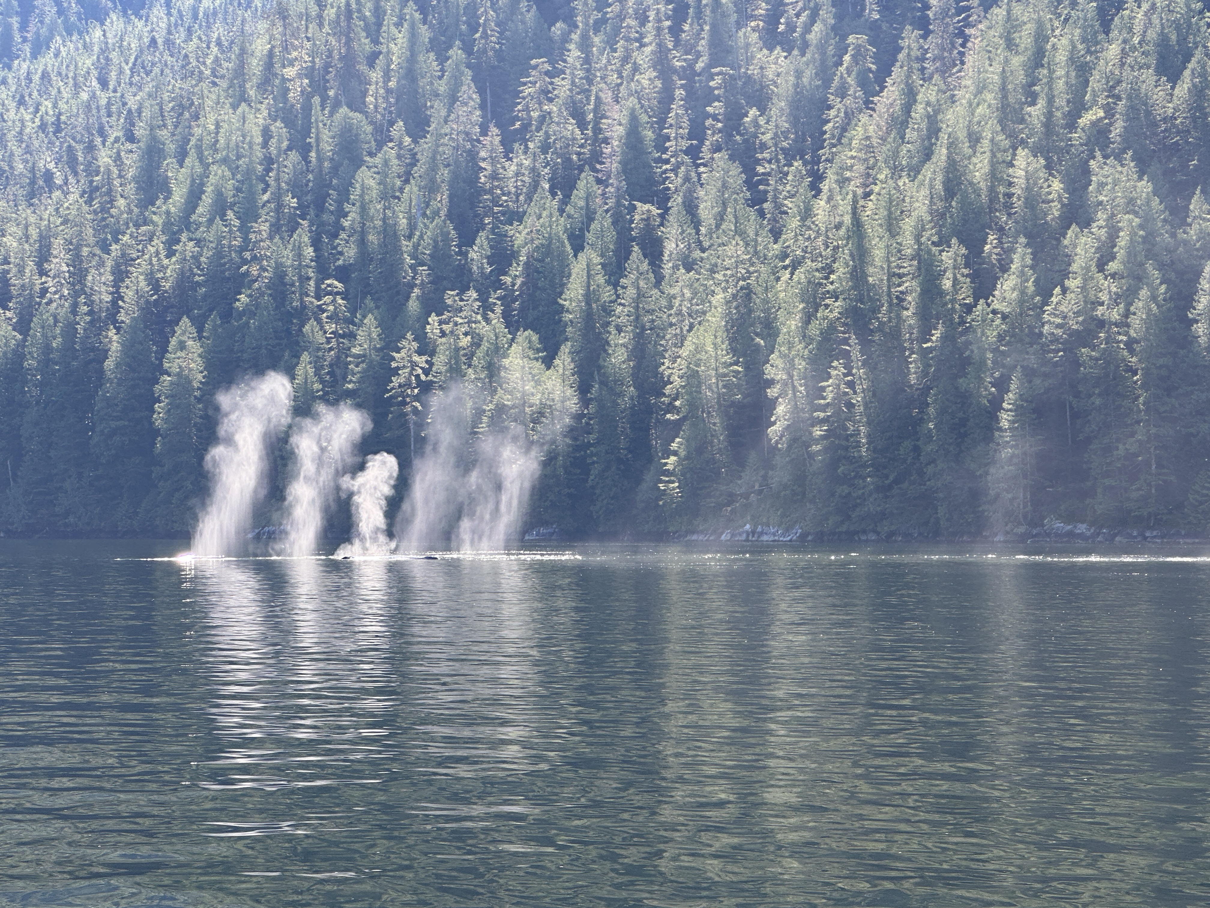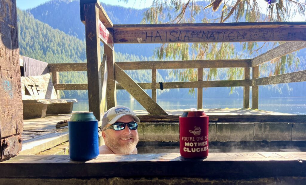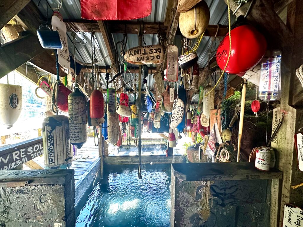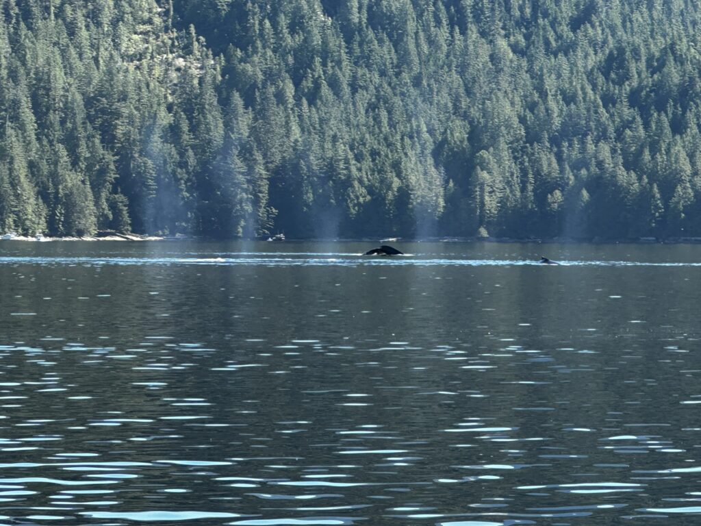 After a few nights in Prince Rupert we again pointed the bow south. Passing some big ships as we left the city, we entered the Grenville Channel, another narrow passage with strong currents. We stopped overnight at Verney Falls in Lowe Inlet. This was a fairly large but protected bay with a waterfall at the head of the bay. We were greeted by a black bear on shore as we anchored. The next day we completed the passage through Grenville Channel and headed north to Bishop Bay Hot Springs. This place was A-Ma-Zing! Not only was there a hot spring with a cement pool covered with memorabilia left by visiting boats everywhere, but there was a crazy whale show every day. We stayed for an extra day because it was so good. There were several groups of humpback whales that would breach and then hit the water so hard it sounded like a gunshot echoing off the surrounding cliffs.