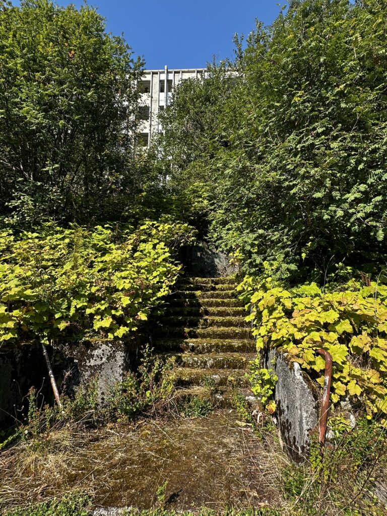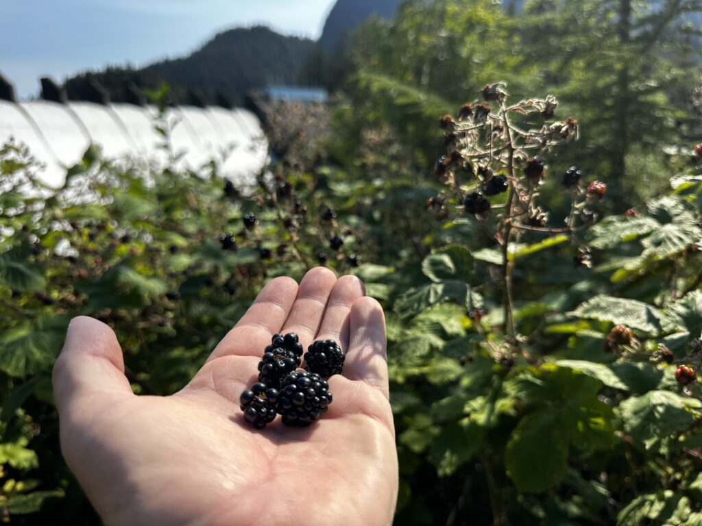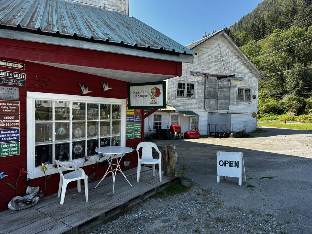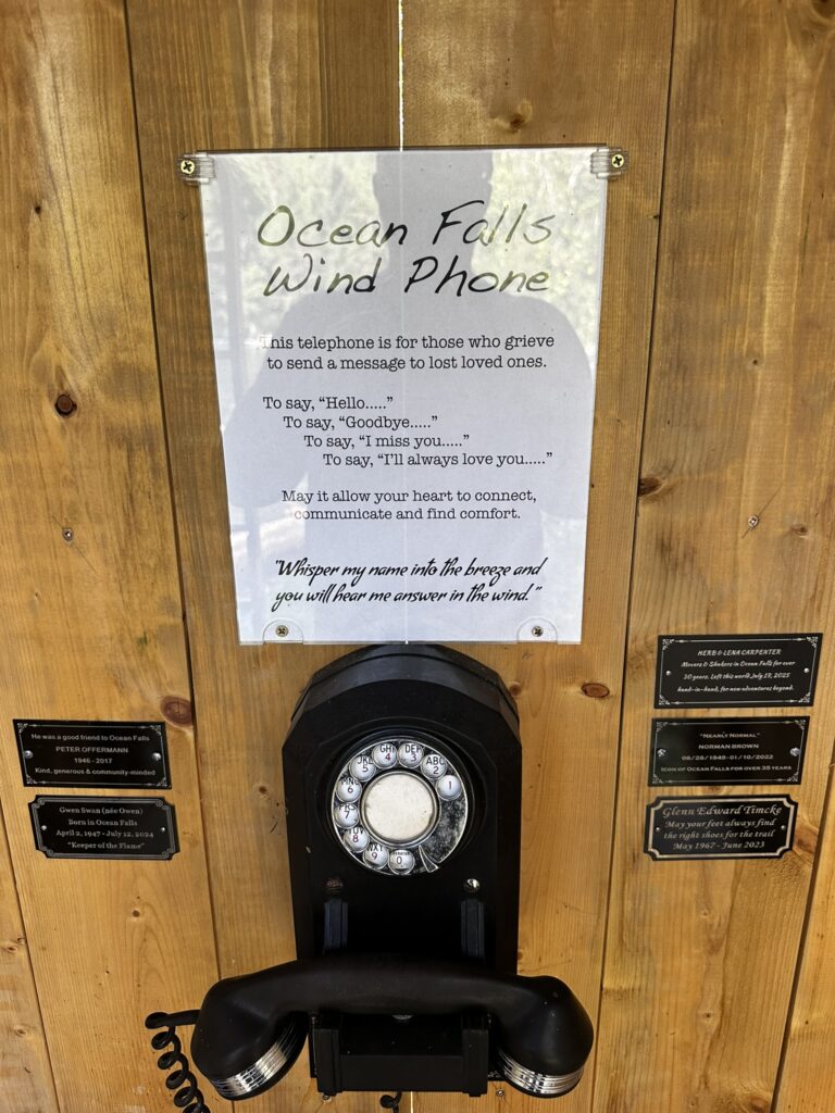 After a few peaceful days in Shearwater, we topped off the diesel tanks and headed off to the town of Ocean Falls. This is an old pulp mill company town that has been largely abandoned leaving hulking remains of the old hotel, apartment complex, and homes. It was cool to wander amongst the old buildings although we did not enter any. This was a thriving town with a large pulp mill powered by the adjacent hydroelectric dam. In its heyday it had several thousand residents. The mill shut down for good in the 1980’s and the town now has only a few dozen residents. The dam continues to supply electrical power to the nearby communities of Ocean Falls, Shearwater and Bella Bella. It also now powers a Bitcoin mining operation. There is still ferry service, and a post office and the docks remain very well maintained. It was a fun stop where we explored the town and collected wild blackberries. We even met a fellow cruiser working in the post office with whom we had shared anchorage with in Tenacatita, Mexico. It’s a small cruising community.